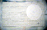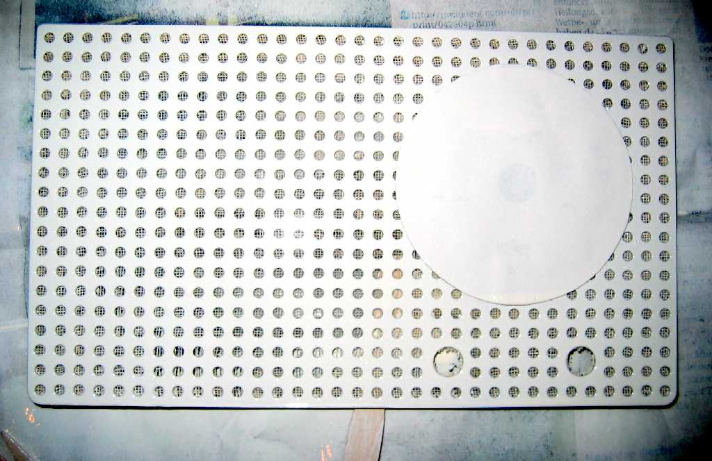 Hier ist das auf der Rückseite des Lochbleches untrennbare aufgeklebte Stoffgeflecht durch